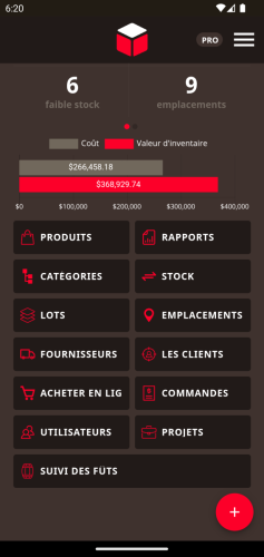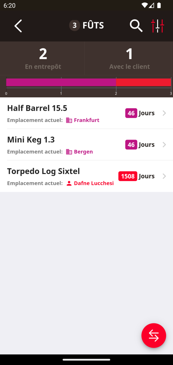 Depuis la page d’accueil du module de fûts, touchez le bouton rouge en bas à droite (icône avec deux flèches). Cela ouvrira un formulaire pour définir la localisation du fût : en entrepôt ou chez un client.