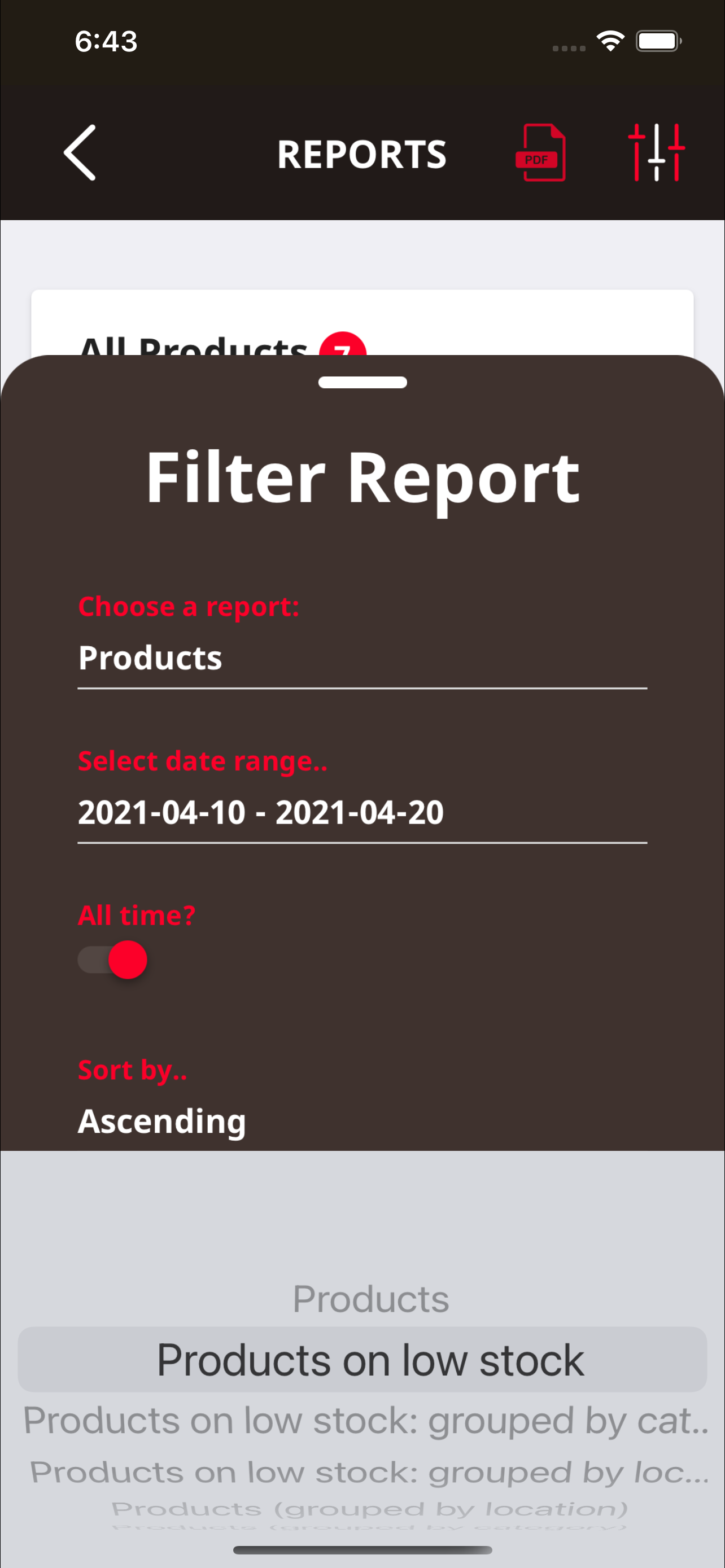 PDF, Excel அல்லது CSV வடிவத்தில் அறிக்கைகளை உருவாக்கவும். தயாரிப்பு, பங்கு அளவு, வகை, இடம், விலை மற்றும் பலவற்றின் அடிப்படையில் வடிகட்டவும்.